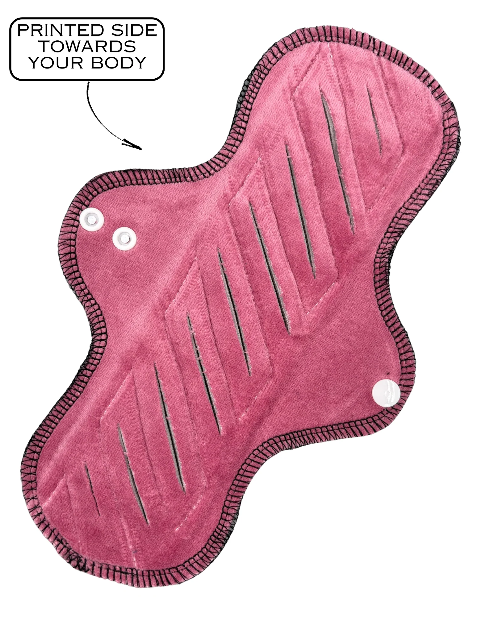 Cotton Velour is a luxuriously soft fabric to have against your vulva. Its texture adds an extra cozy feel while grabbing onto your flow, this coupled with the slits in the fabric provide additional surface area for absorption and will help distribute your flow more evenly throughout the pad, reducing the chances of leakage during heavy gushing flows.